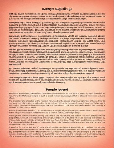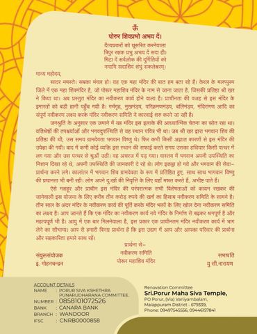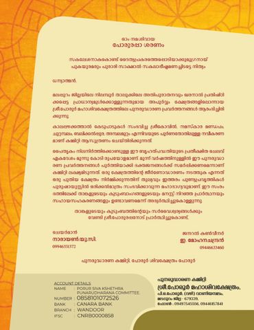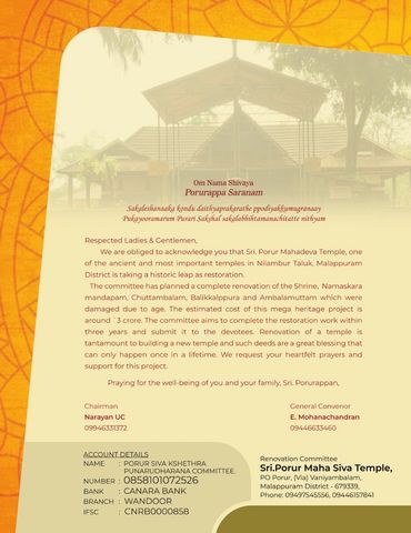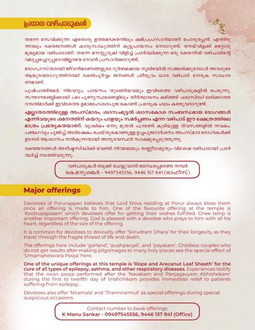 The Porur Devaswom along with the devotees of Porurappan has always come forward to renovate and maintain the grace of the temple in its full glory from time to time.